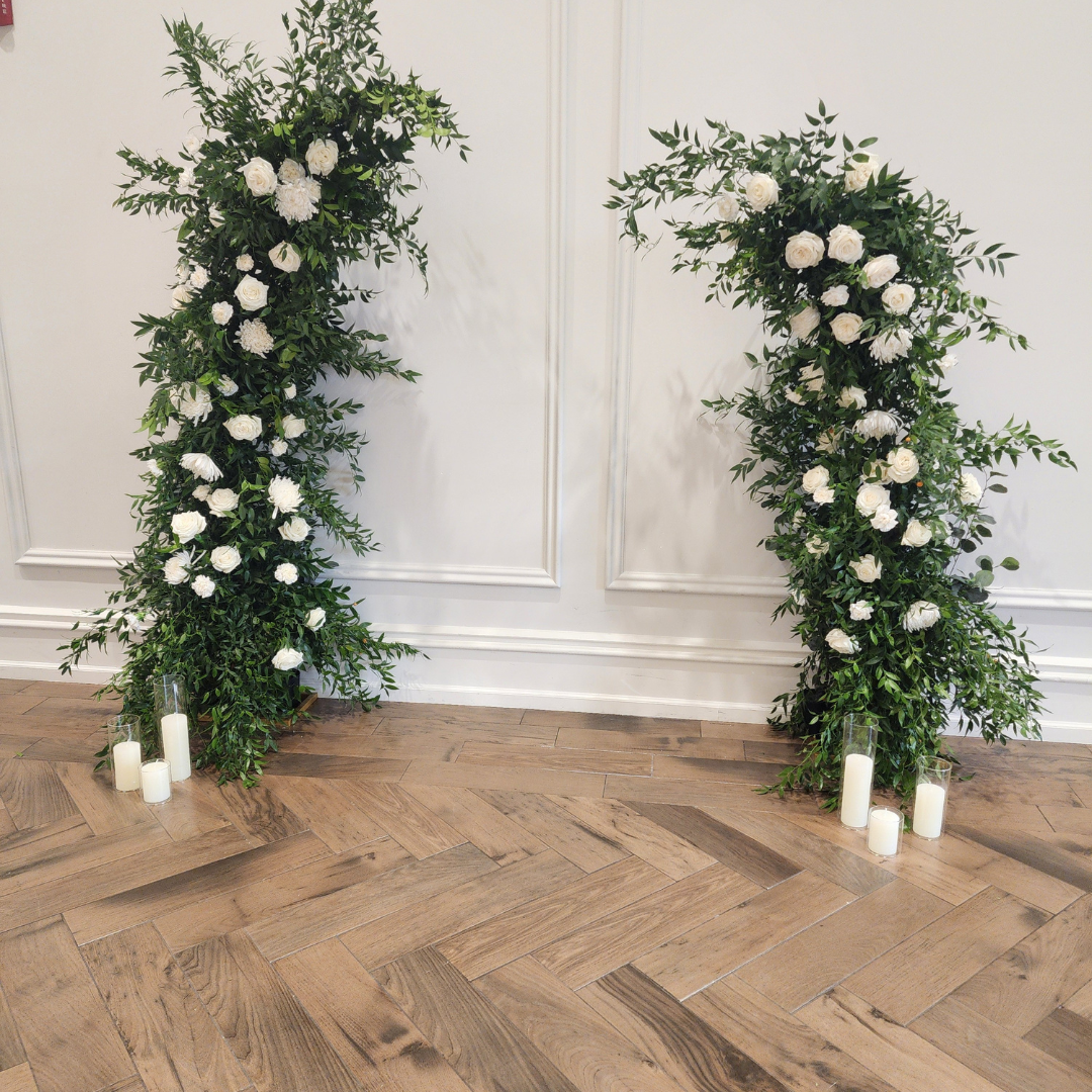 Asymmetrical Wedding Arch - Green & White Roses