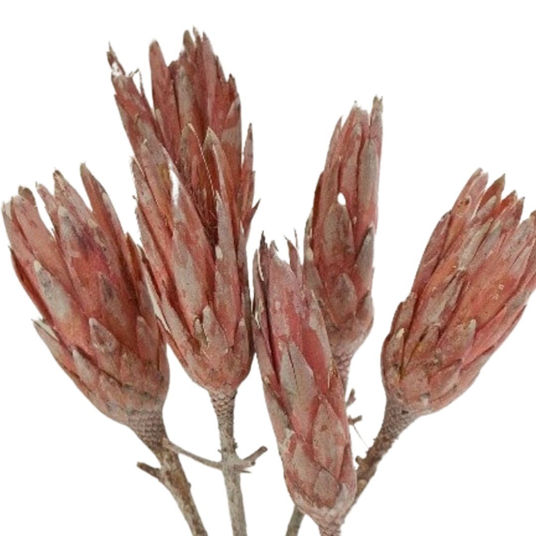 Natural dried protea flowers in a pink wash, 3 stems in a bundle.