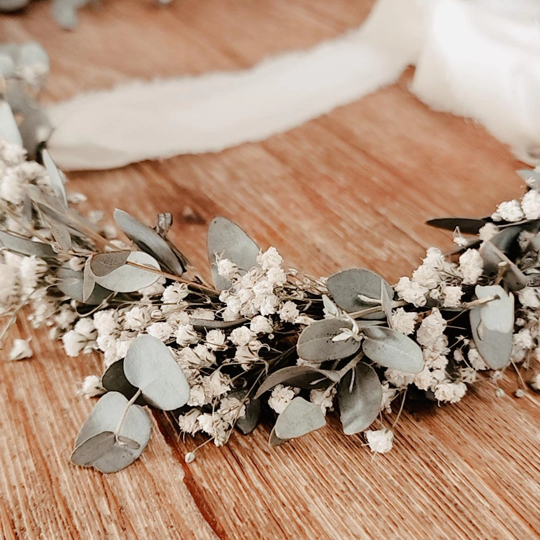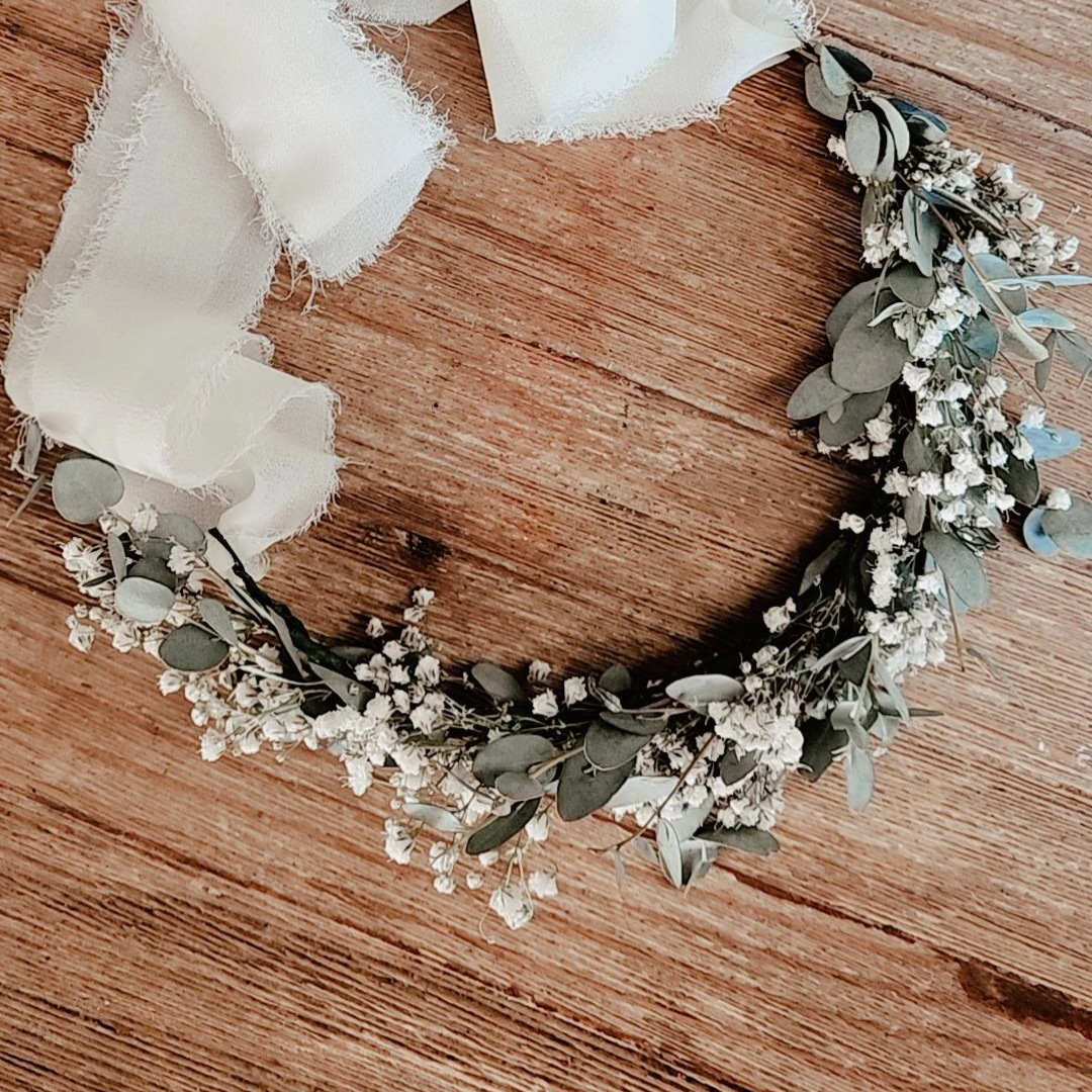 This flower crown is perfect for a bride, bridesmaids or flower girl! Made for a fuller flower crown look. Looking for something more subtle? Check out our Euc + Baby's Breath Mini Crown.