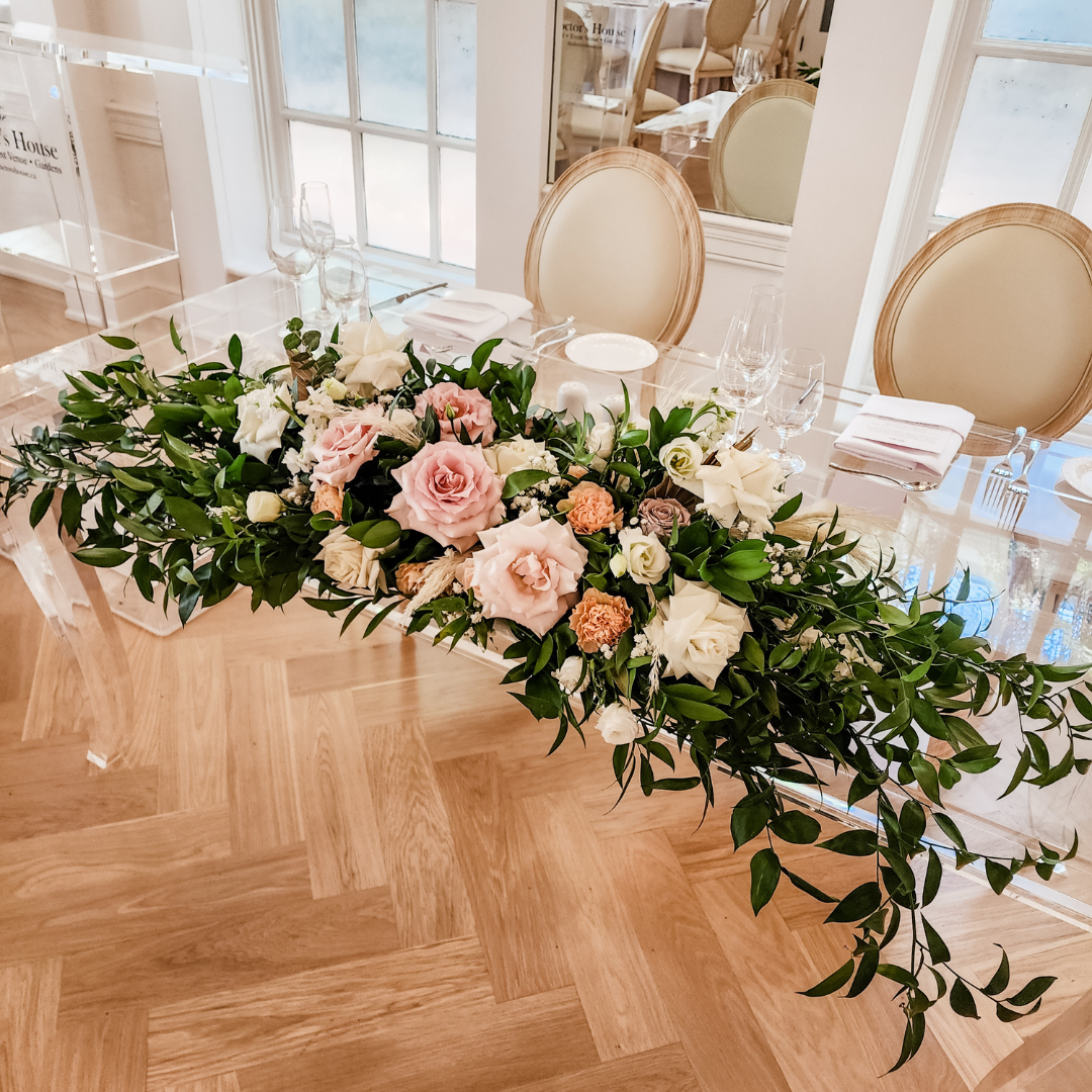 This flower installation is perfect for a luxurious addition to your special event. Featuring a combination of fresh Roses, Eucalyptus and other flowers, all nestled among lush greenery, it's an effortless statement of refined beauty for your sweetheart table, fireplace mantle or arbour. Make your event all the more memorable with this gorgeous botanical installation.