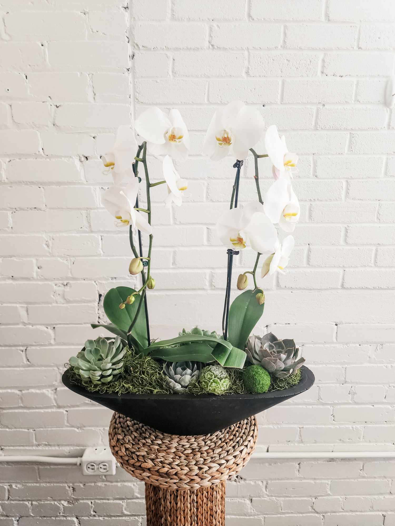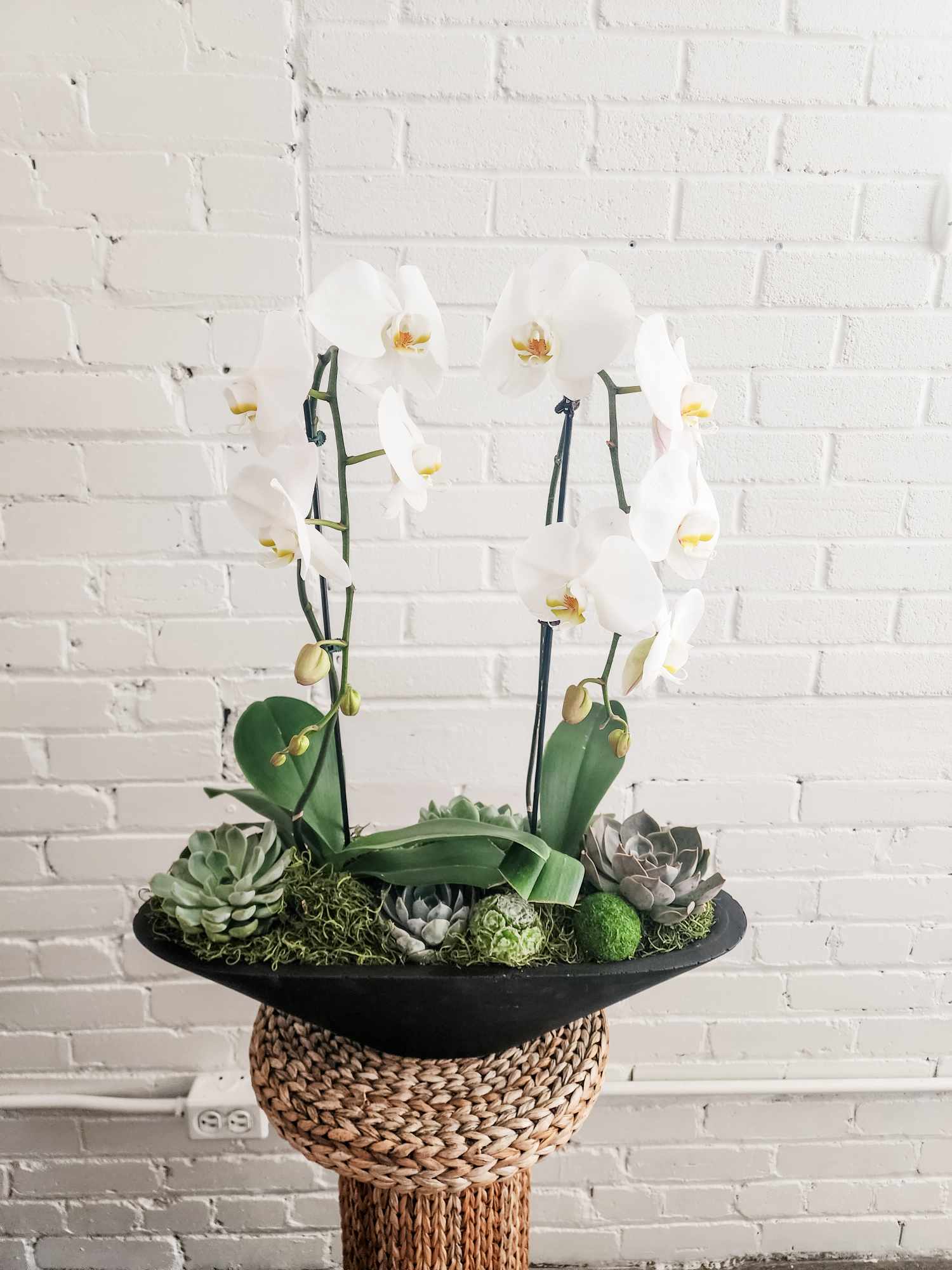 This Luxe Orchid & Succulent Arrangement is an ideal blend of floral sophistication and contemporary style. The unique fiberclay black vase measures 22" x 8" x 5", and is paired with two Orchids and a selection of large and small succulents that weaves floral and design into one.