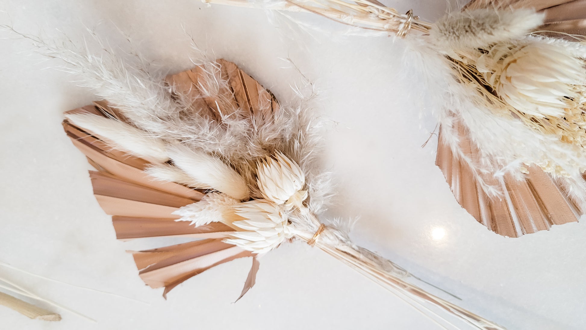 Style - Nude spear palm with soft whites & beige seasonal floral tones.